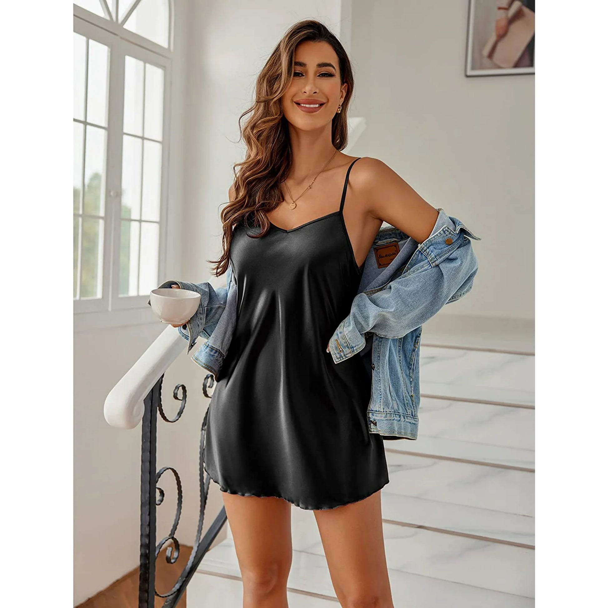 Women Sleepwear Satin Nightgown Mini Slip Chemise Short Nightwear Black